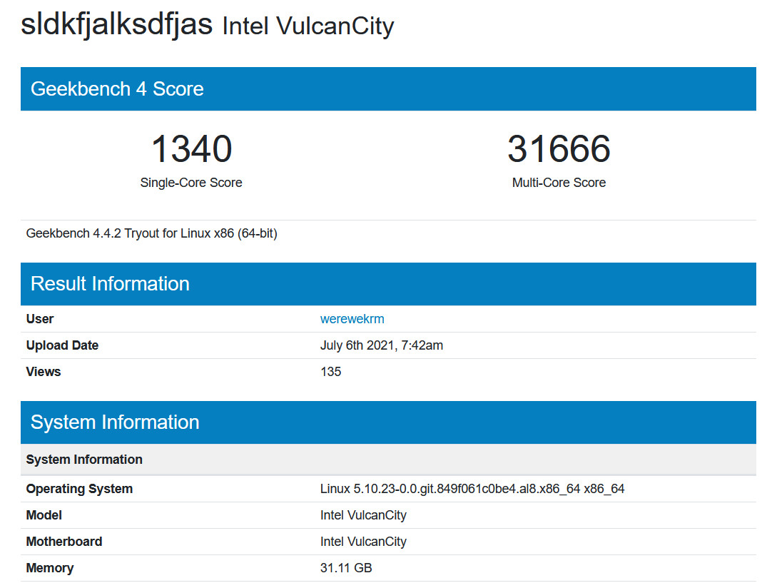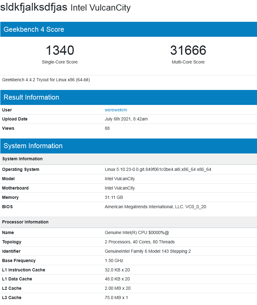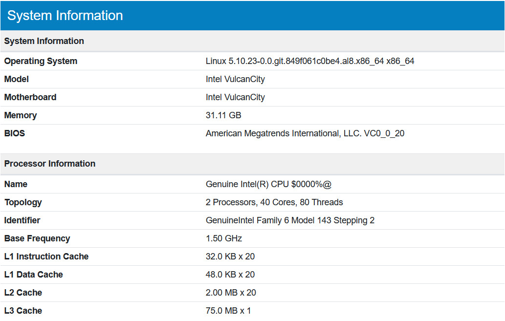 По данным ресурса VideoCardz, изучившего данные первым, процессор обладает 20 ядрами и 40 потоками, он работал в составе двупроцессорной платформы под кодовым названием VulcanCity. Geekbench не смог распознать представителя Sapphire Rapids, идентифицировать модель можно по обозначению Family 6 Model 143 Stepping 2. Результаты достаточно плохие, процессор уступает Ryzen 9 5950X и даже многим другим не самым новым моделям, он явно не работает на полной скорости, резюмирует VideoCardz.
