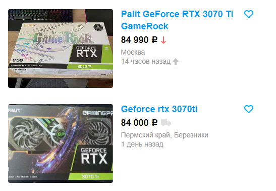 Сегодня всё иначе, ведь многие перекупщики брали видеокарты с высокой наценкой по сравнению с рекомендованной стоимостью, надеясь их продать с большой выгодой. Вот только наполеоновским планам не суждено сбыться, ведь розничные сети начали сбрасывать цены. Для начала несколько примеров. Итак, в рознице GeForce RTX 3070 Ti стартует с 90 000 рублей, ну а на Авито с 85 тысяч. Любопытно, кто-то вообще ведётся на скидку в 5 тысяч? Очевидно, что видеокарта покупалась гораздо дороже 100 000 рублей, а несчастный продавец не знает, как от неё избавиться.