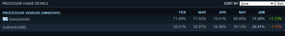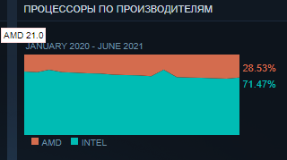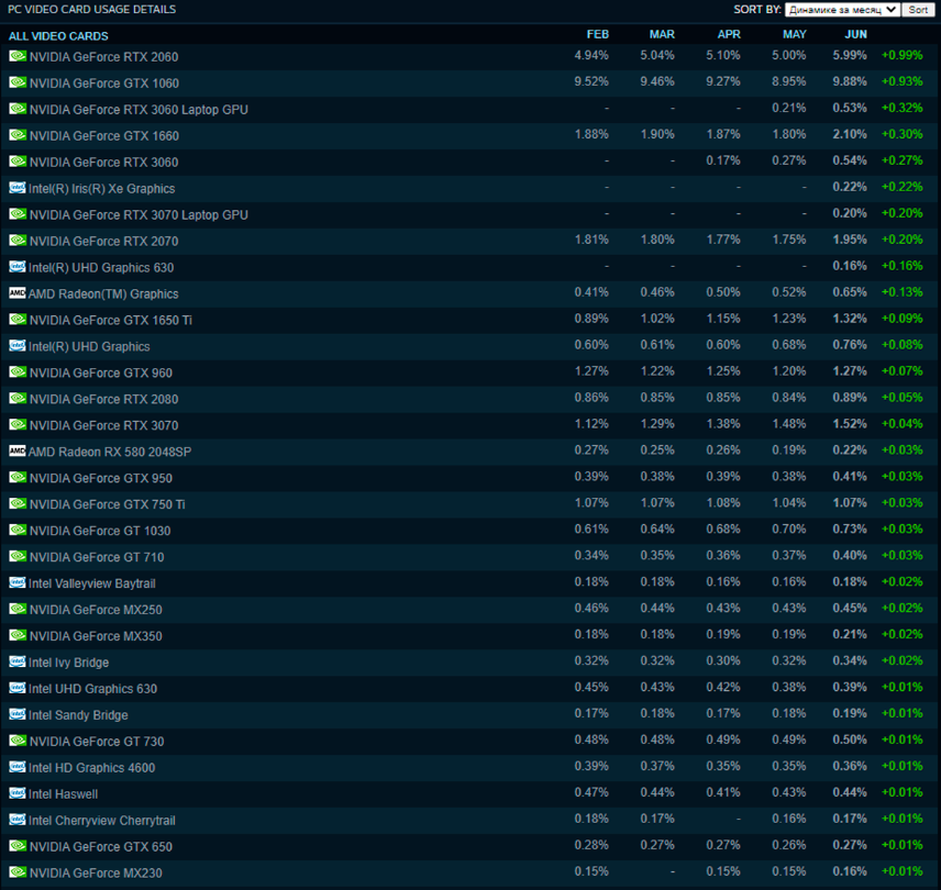 На втором месте с небольшим отрывом GeForce GTX 1060. Сложно представить, чтобы NVIDIA неожиданно начала выпускать подобные видеокарты. Скорее всего их появление в статистике связано с распродажей ферм в Китае и других странах, ведь майнинг Эфира становится всё менее прибыльным. Из любопытного в июне можно отметить появление в списке Iris Xe. Это дискретная видеокарта DG1 производства Intel, которая поставляется вместе с готовыми системами и является бюджетным решением. Как видите, даже столь примитивная видеокарта вызвала больше интереса, чем продукция AMD.