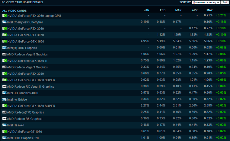 Прежде всего нужно уточнить следующую информацию: чем больше процент изменений за месяц, тем больше конкретной модели видеокарт пришло на рынок. Поскольку многие геймеры имеют аккаунты в Steam и постоянно ими пользуются, то данные тут же отображаются в ежемесячных изменениях. Итак, на первом месте с приростом в 1% у нас GeForce RTX 2060. Ещё в ноябре 2020 года стало известно, что NVIDIA готовится остановить выпуск подобных графических чипов. Будем надеяться, что ребята осознали свою ошибку, ведь такое количество новых видеокарт не могло появиться из пустоты. В июне сообщалось, что было принято решение увеличить выпуск GeForce RTX 2060, а значит в будущем можно надеяться на рост подобных видеокарт в Steam.