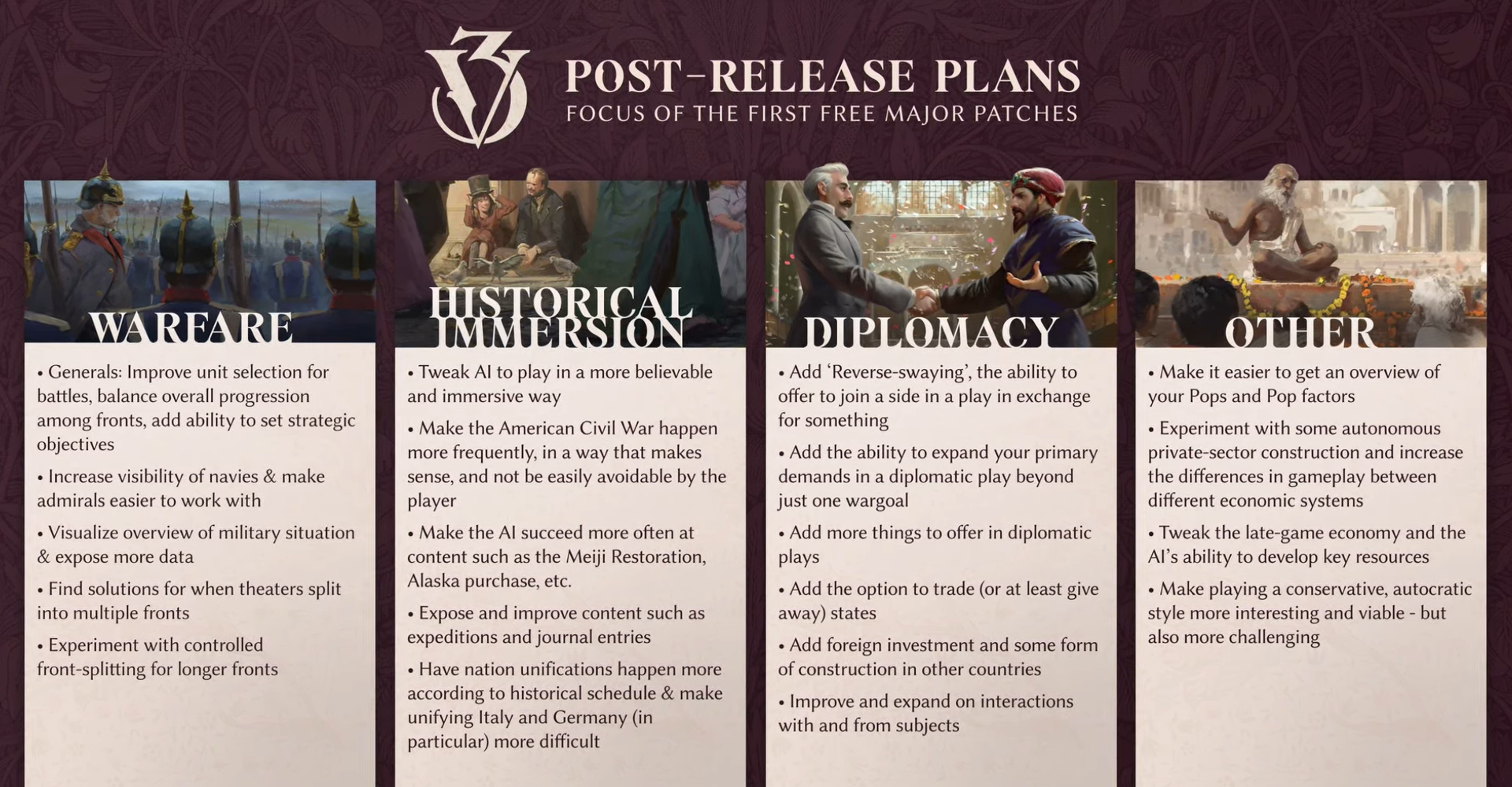 Первые улучшения коснутся именно военных механик, намерений возвращаться к более тактическим системам в Victoria 3 у разработчиков нет, но улучшить уже существующую и дать больше контроля — обязательно. В определенных областях у игроков появится больше контроля, а также будет переработан интерфейс на более дружелюбный к новичкам. Потом идут остальные улучшения, которые описаны выше.