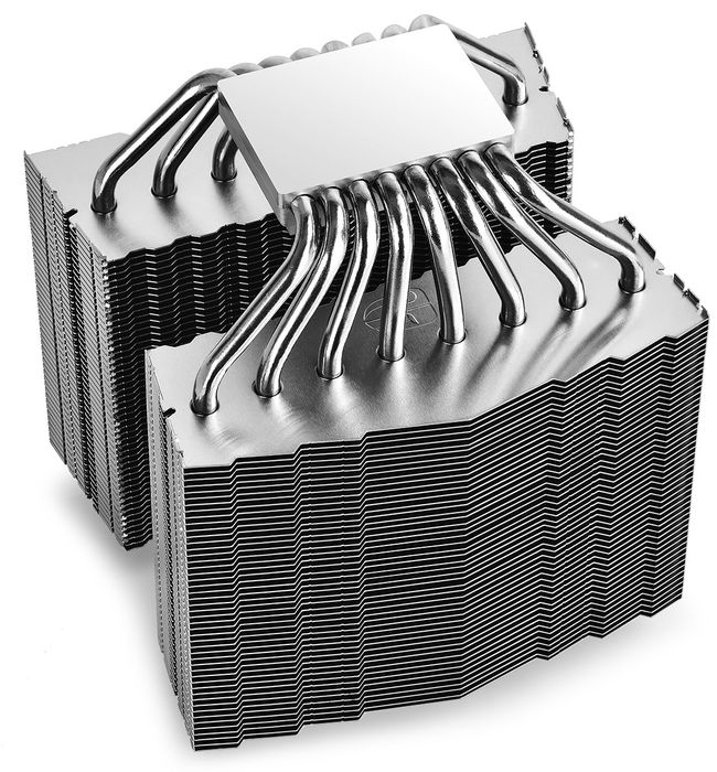 Конструкция выполнена из двух радиаторов, состоящих из алюминиевых рёбер, нанизанных на восемь никелированных теплотрубок.