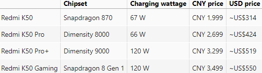 Инсайдер добавляет, что стоимость смартфонов серии начнется с 1999 юаней (около 314 долларов) за версию Redmi K50. Предположительно, модель начального уровня будет работать на чипсете Snapdragon 870. Более продвинутая модель Redmi K50 Pro получит чипсет Dimensity 8000 от Mediatek, а модель Redmi K50 Pro Plus будет работать на флагманском чипсете Dimensity 9000 от той же Mediatek. Игровая версия смартфона под названием Redmi K50 Gaming будет использовать чипсет Snapdragon 8 Gen 1 и стоить 3499 юаней (около 550 долларов). Согласно информации @Shadow_Leak смартфоны серии Redmi K50 получат следующие цены: