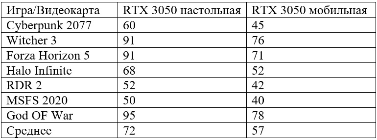 Ответить на столь сложный вопрос взялись представители канала Benchmark Lab. Модели и производителей тех или иных комплектующих вы можете узнать самостоятельно, а мы лишь изучим результаты и сделаем выводы. В качестве примера была выбрана видеокарта GeForce RTX 3050, которая является самой бюджетной в серии и вышла совсем недавно. Её мобильный аналог поступил в продажу давно и уже успел стать популярным. Давайте взглянем на таблицу с показателями по каждой игре, а также сравним средние.
