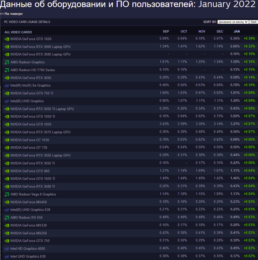 Новенькая видеокарта NVIDIA GeForce RTX 3050 появилась в январской статистике сервиса Steam от Valve, и хотя пока ее доля составляет скромные 0.58% от общей массы графических ускорителей, этот показатель наверняка будет быстро расти, если вендоры смогут поставить достаточное количество единиц. В отличие от старших решений Ampere, RTX 3050 выглядит более посильно для любителей компьютерных игр по цене, причем примечательно, что после ее выхода и поступления в продажу видеокарты AMD Radeon RX 6500 XT, снизились цены и на дефицитные GTX 1660 Ti/Super, RTX 2060 и 3060. Повлияло на либерализацию цен и снижение курсов наиболее известных криптовалют - Bitcoin и Ethereum.