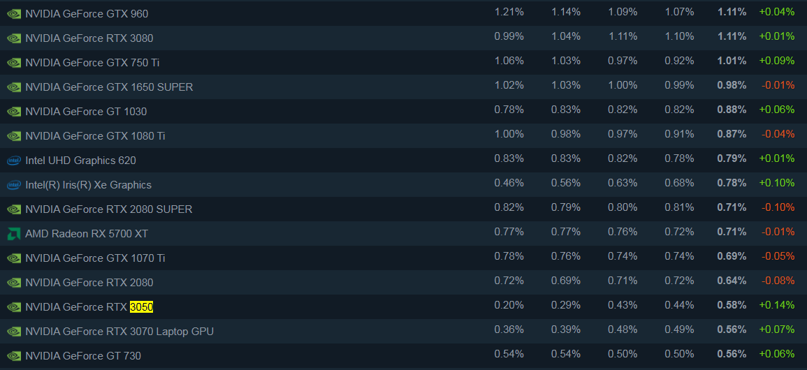 На геймерских форумах часто высказывается предположение, что RTX 3050 могла стать бы новой "народной видеокартой", как в свое время GTX 1060, до сих пор занимающая в Steam лидирующую позицию, но с текущим дефицитом полупроводниковых компонентов и неспособностью производителей и ритейлеров удовлетворить спрос, вероятно, она со временем ограничится местом в топ-10, если вендорам не удастся серьезно нарастить объемы поставок.