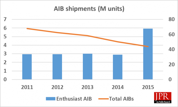 Примечательно, что самые дорогие видеокарты продавались в прошлом году значительно лучше, чем в 2014 году. В частности, их объёмы продаж выросли с 2,9 млн. до 5,9 млн. штук. На фоне общей тенденции к снижению количества проданных видеокарт это весьма обнадёживающая динамика.