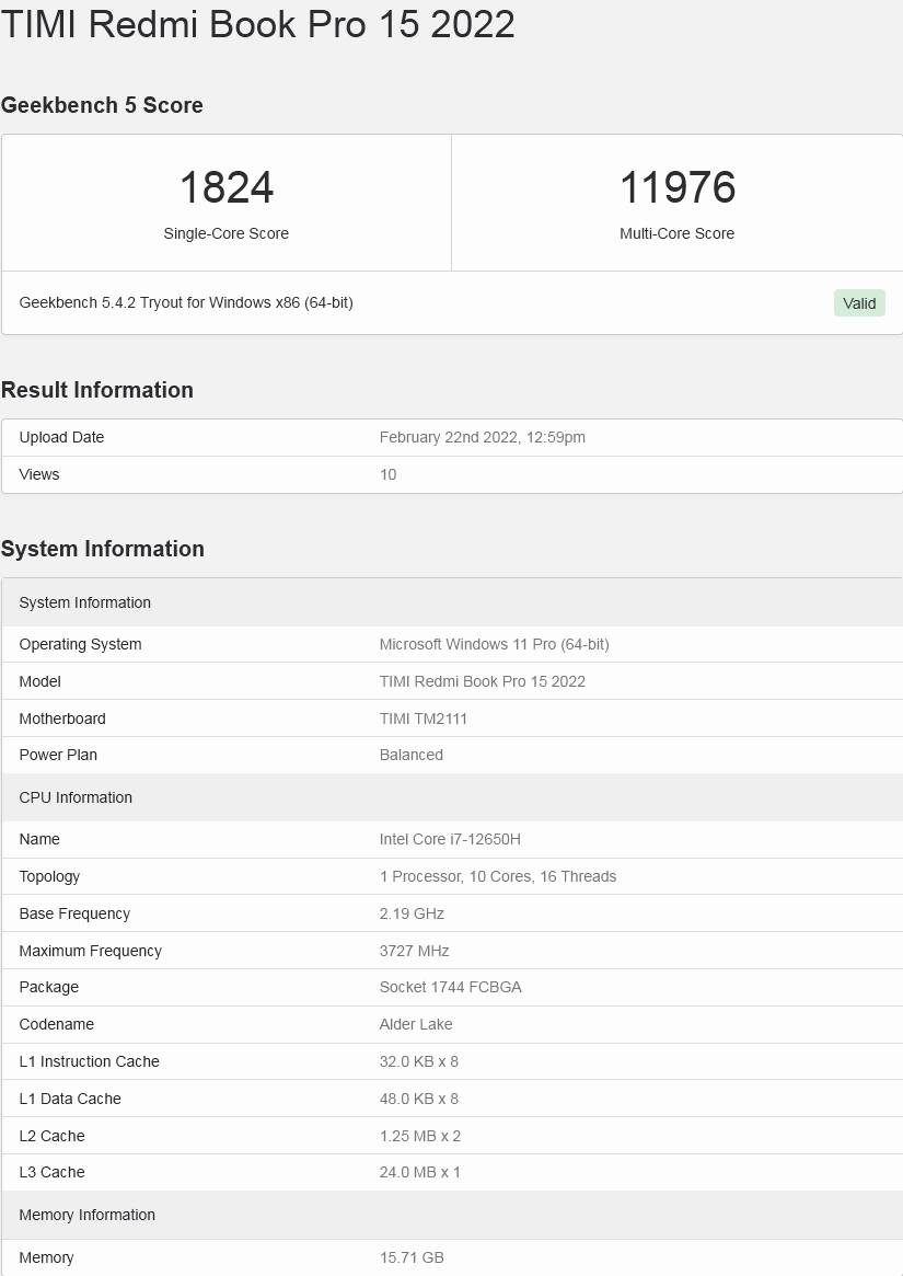 В прошлом году Xiaomi выпустила ноутбуки RedmiBook Pro 15 с процессорами Intel Core 11-го поколения, предлагались различные варианты, вплоть до Core i7-11390H с 4 ядрами и 8 потоками. Похоже, что компания готовится в ближайшее время представить новую серию 2022 года, официально Xiaomi не объявила план выпуска, но на платформе Geekbench уже отметилась первая модель с процессором Core i7-12650H 12-го поколения, сообщает ITHome.