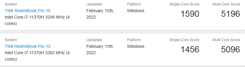 RedmiBook Pro 15 с новым процессором набрал 1800 баллов в одноядерном тестировании и 11872 в многоядерном, что является огромным улучшением, по сравнению с предыдущим поколением. Например, соответствующие результаты моделей с Core i7-11370H достигают примерно 1500 и 5200 баллов.