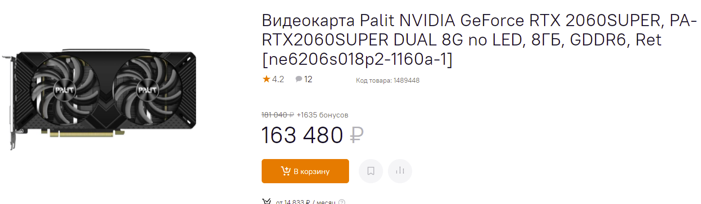 GeForce RTX 3060 медленно, но верно дорожает. Неясно, покупает ли вообще кто-то сегодня видеокарты, но магазин неумолимо накидывает за сутки несколько процентов к и без того неразумной цене. 169 780 за средний уровень производительности – это очень сурово даже по текущим меркам. Звучит странно, но GeForce RTX 2060 SUPER по непонятной причине даже подешевела. В чём причина такой щедрости неясно, но мы бы предложили воздержаться и от этого выгодного предложения.
