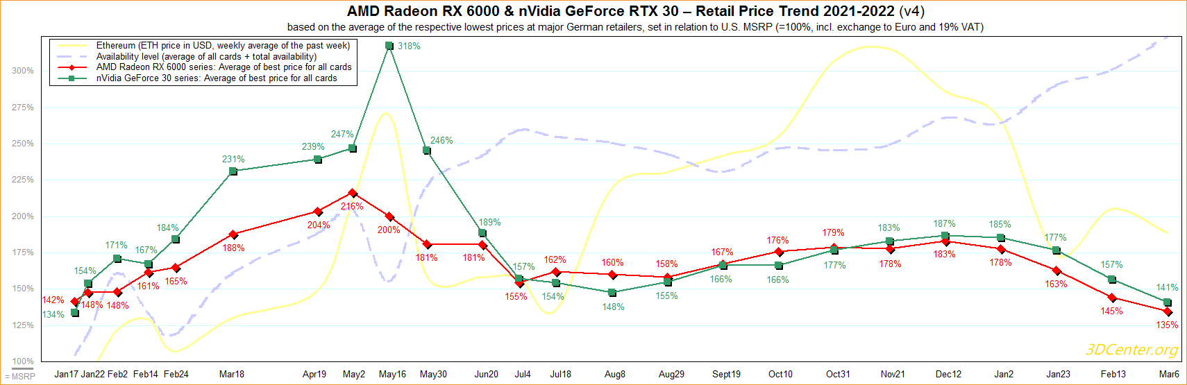 Что до NVIDIA, то продукция этой компании на 41% дороже рекомендованной стоимости. Причина здесь в том, что графические чипы GeForce RTX 3000-й серии намного лучше подходят для майнинга Эфира. При этом даже блокировка хешрейта не смогла остановить фермеров, ведь даже 70% хешрейта – это лучше, чем могут предложить аналоги Radeon RX 6000-й серии. Эксперты полагают, что дальнейшее удешевление графических чипов столкнётся с целым рядом препятствий. В первую очередь упоминается политический кризис и неопределённость на биржах. Сюда стоит прибавить резкий рост цен на энергоносители, что станет ударом для экономики большинства европейских стран. Вполне возможно, что покупательская способность снизится, а ритейлеры попытаются компенсировать ущерб за счёт роста цен.