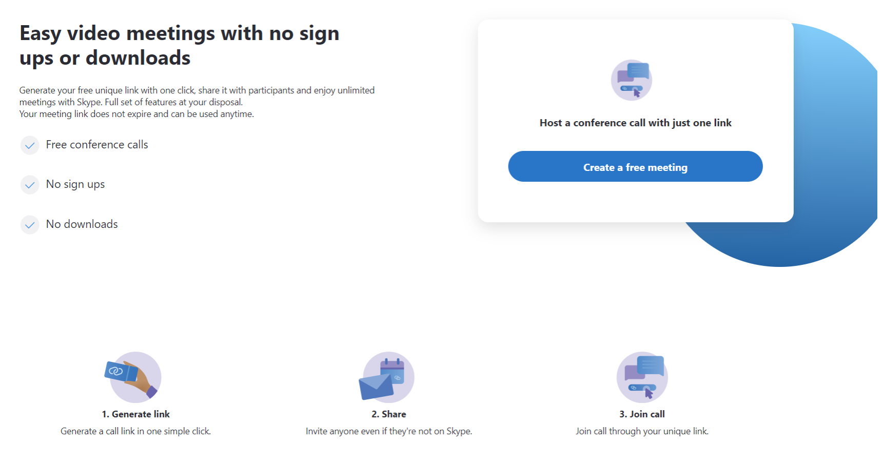 Функция называется Meet Now и процесс подключения достаточно быстрый и простой. Каждая видеоконференция получает уникальную ссылку, которую автор может отправить другим участникам, в том числе незарегистрированным в Skype. У этих ссылок нет срока годности и они могут использоваться в любое время.