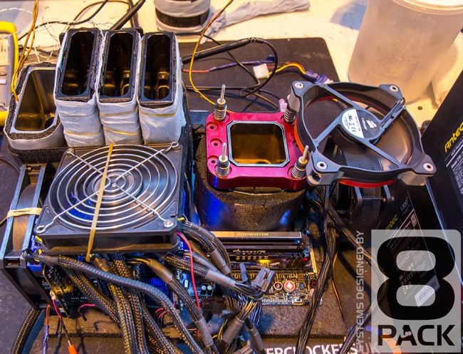 Само собой, без фирменного экстремального разгона нескольких видеокарт в одной системе дело тоже не обошлось. Четыре видеокарты MSI Radeon R9 290X Lightning получили по резервуару для жидкого азота и были запечатлены на фото ещё до того, как он появился на сцене: