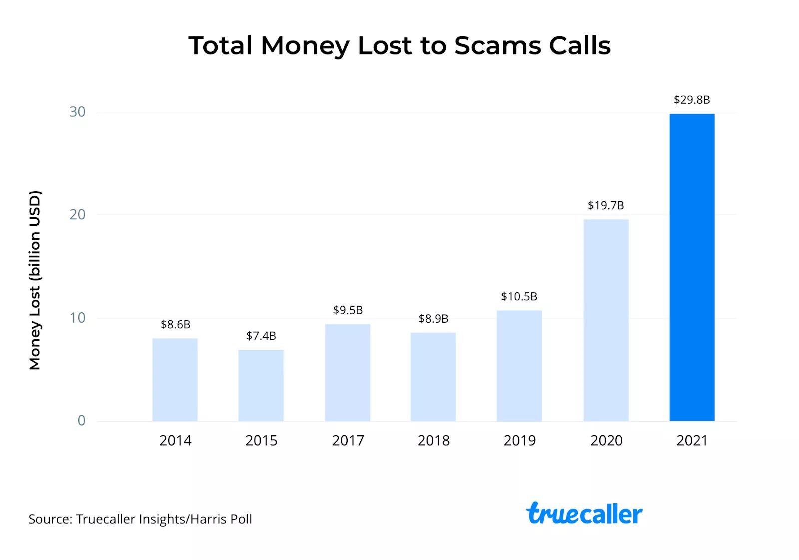 60% пострадавших стали жертвами роботизированных звонков. Средний убыток от их действий составляет $502 против $351 годом ранее, что означает разницу на 43%. Всего мошенники смогли заполучить $29,8 млрд.