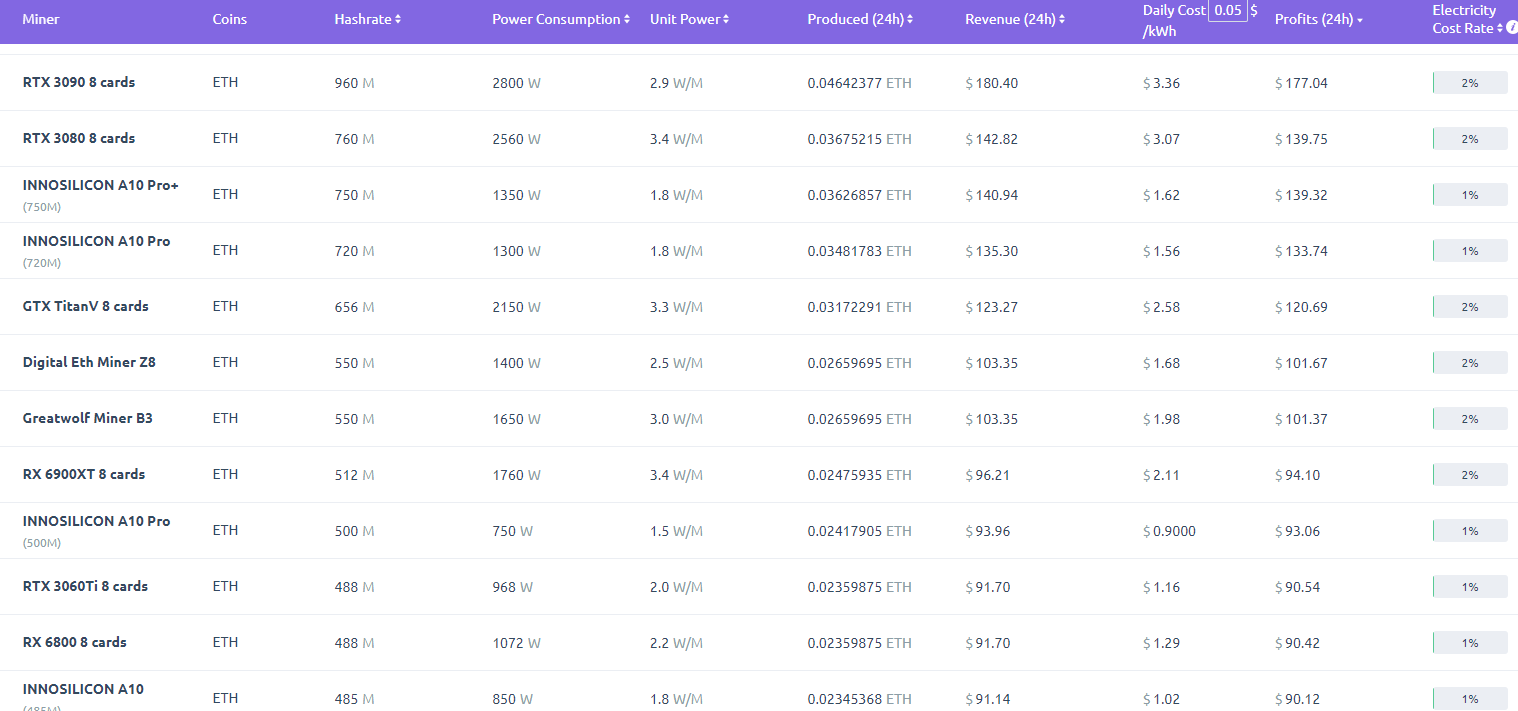 Высокие комиссии позволяли в мае за сутки на GeForce RTX 3080 генерировать почти 140 долларов на ферму, что давало больше 500 долларов в месяц на данной видеокарте. В середине июня ситуация была куда хуже (62 доллара на ферму в сутки), но тогда и цена Эфира с трудом достигала 2300 долларов. Обычно мы ещё изучаем доходность на видеокарте GeForce RTX 3060 Ti, но в данном случае ясно, что она покажет аналогичные вышеупомянутой модели показатели прибыльности. Стоит указать, что таких видеокарт без блокировки хешрейта вообще не осталось, поэтому в дальнейшем изучать их доходность нецелесообразно.