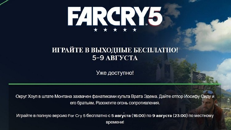 Все поклонники серии Far Cry, чей компьютер сможет потянуть пятую часть, наверняка готовились к "Бесплатным выходным от Ubisoft", которые так громко рекламировались. Если вы не знаете, о чём речь, напомним: 5 августа Ubisoft официально начали бесплатную раздачу игры Far Cry 5. Сроком окончания пробной версии запланировали вечер 9 августа, однако уже вчера утром игра по неизвестным причинам обратно стала платной.