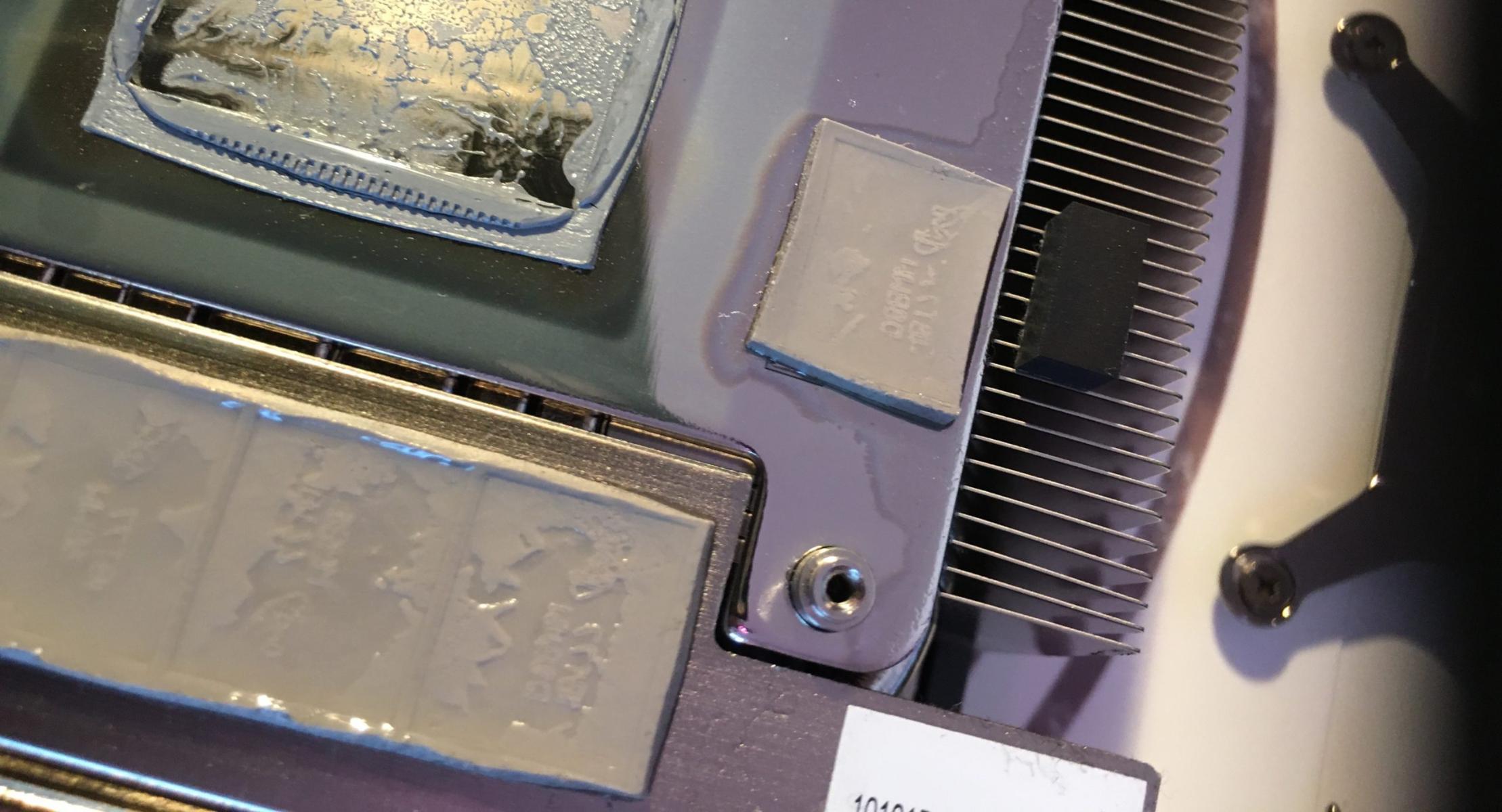 На представленном специалистами фото видны буквально лужи силикона, эффектно бликующие на свету, как будто демонстрирующие технологию рейтрейсинга. Специалисты выдвинули предположение, что производитель использует мягкие термопрокладки, чтобы избежать проблемы чрезмерного давления на чипы памяти, вызывающего постепенное повреждение припоя, связывающего контакты чипа и основной платы, как это ранее случалось с видеокартами серии NVIDIA GeForce RTX 2080 Ti. Более того, вытекание силикона из термоинтерфейса столь обильное, что он растекается по плате и теплосъёмной пластине.