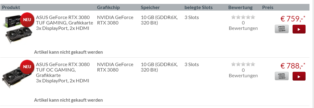 Самыми бюджетными видеокартами из представленных моделей оказались модели RTX 3080 в исполнении вендера PNY, которого крайне редко можно встретить в наших магазинах, и который не имеет собственных производственных мощностей, выступая лишь посредником. Чуть больший ценник достался известным нам видеокартам в исполнении Gigabyte. Однако и ASUS не отличились крайне завышенными ценниками и их видеокарты также стоят приемлемых денег