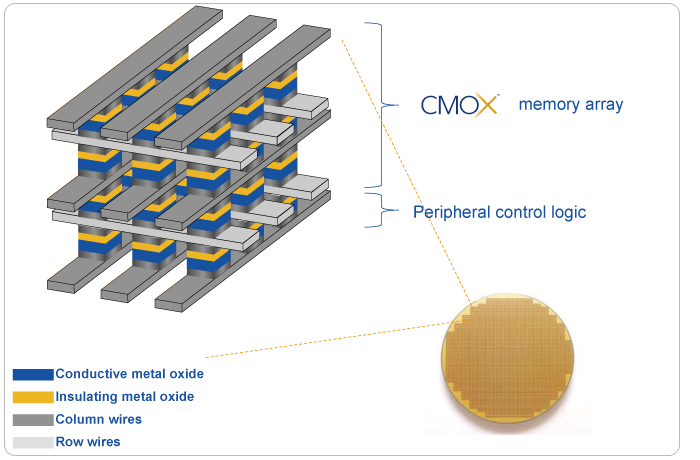 Кроме того, технология CMOx (Complementary Metal Oxide) сможет обеспечить заметный прирост плотности хранения данных в сравнении с любым из существующих решений. Использование CMOx не только сделает накопители быстрее и надёжнее, но и дешевле: с экономической точки зрения изготовление чипов по этой технологии гораздо выгоднее. Любопытно, но память типа CMOx не требует использования транзисторов в ячейках, а принцип работы основан на применении новых материалов (сочетания металлических оксидов), из которых будут создаваться пассивные перезаписываемые массивы памяти.