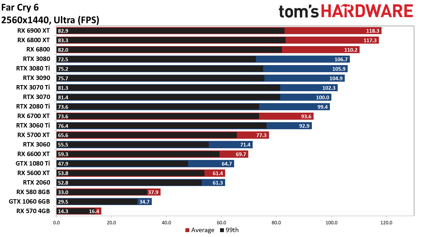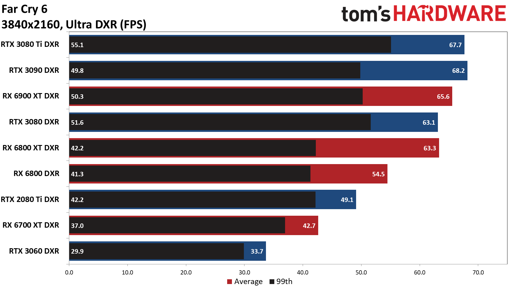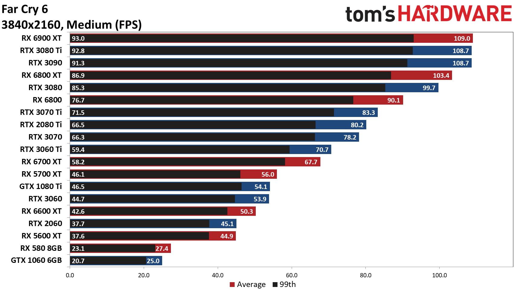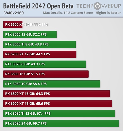 Разрешение 4K окончательно завершает баловство оптимизации и все графические решения показывают именно тот уровень производительности, каким они располагают. На вершине оказывает RX 6900 XT, опередившая всего на 0,3 fps RTX 3080 Ti. На этом этапе GTX 1050 Ti гордо покидает тест, как и все видеокарты с 4 ГБ видеопамяти.