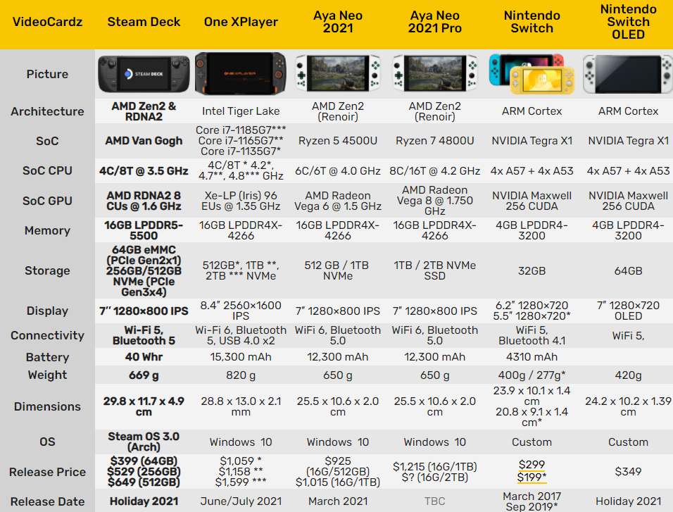 Консоль оснащена APU AMD Van Gogh на базе микроархитектуры Zen2 и RDNA2. Она предлагается с вариантами накопителей на 64 ГБ, 256 ГБ и 512 ГБ, которые можно дополнительно расширить с помощью слота MicroSD, что рекомендуется в соответствии с видео. Steam Deck оснащен 16 ГБ оперативной памяти LPDDR5, 7-дюймовым дисплеем с разрешением 1280 × 800 и батареей на 40 Вт · ч. Консоль стоит от 399 до 649 долларов в зависимости от типа хранилища.