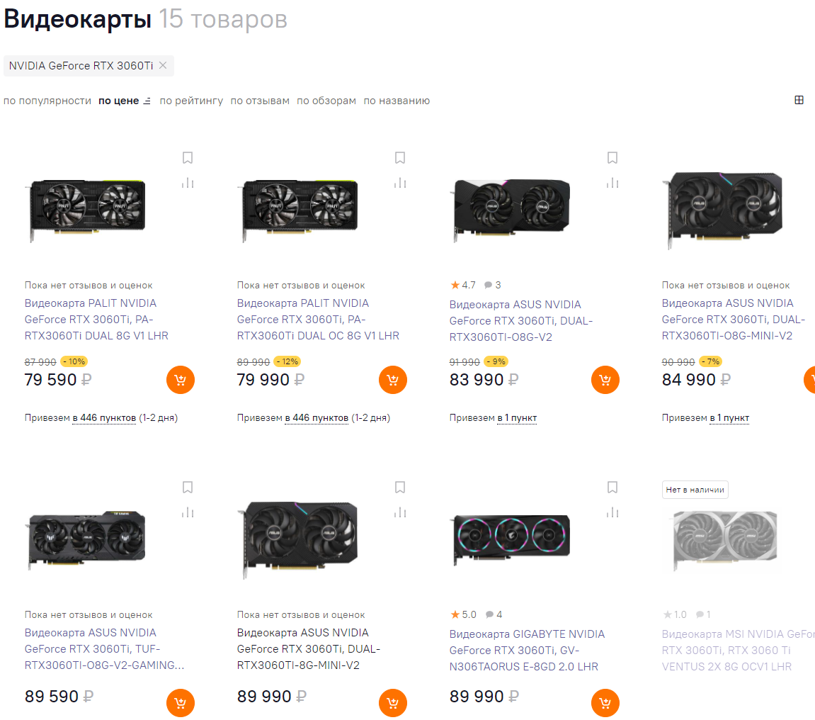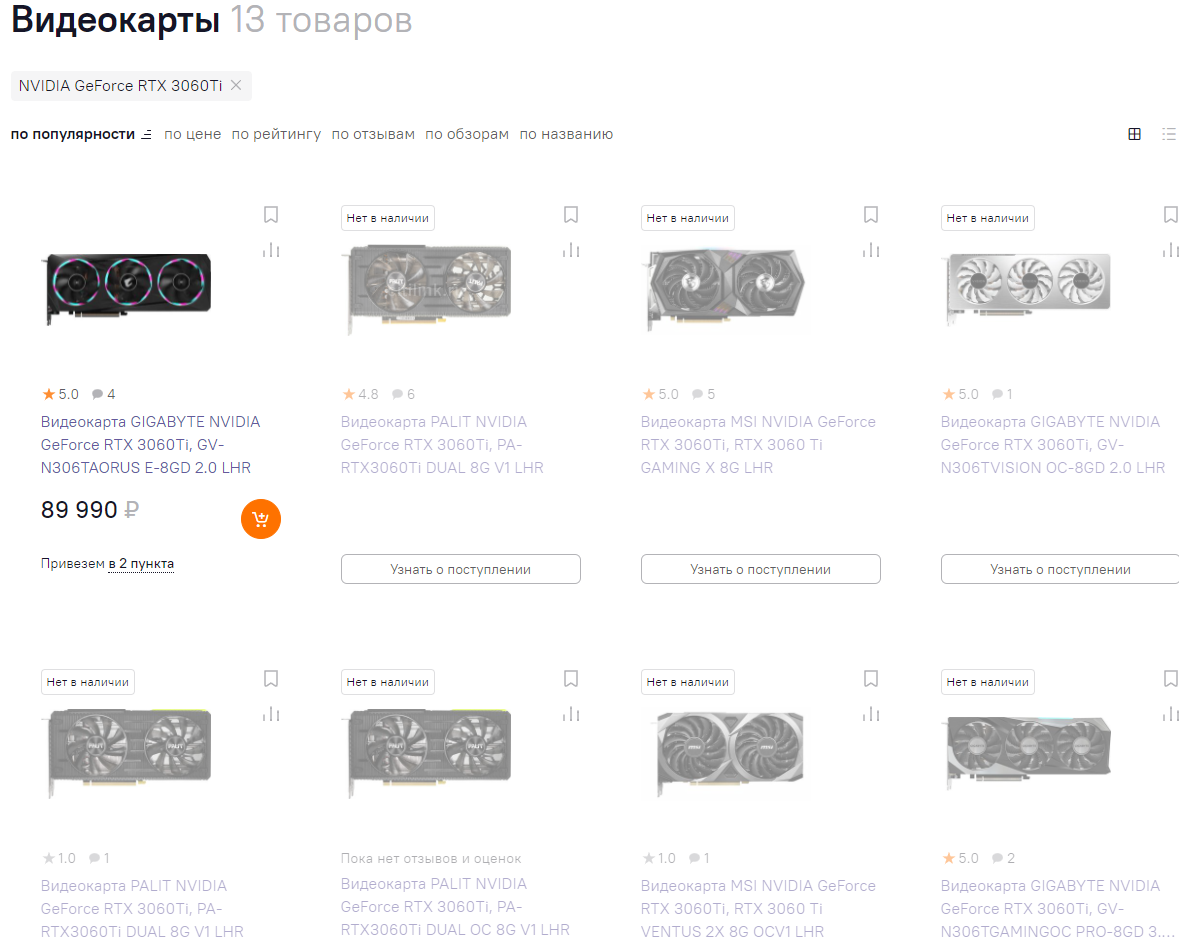 Прежде всего предлагаем вам посмотреть на видеокарты серии GeForce RTX 3060 Ti на изображении ниже. Как видите, сегодня для покупки доступна только одна такая модель, хотя ещё 2 октября (следующий скриншот) их было 7. Судя по всему, это стало результатом того, что геймеры отчаянно раскупали подешевевшие графические чипы. Поскольку GeForce RTX 3060 Ti в продаже почти не осталось, геймеры перешли на менее производительную GeForce RTX 3060.