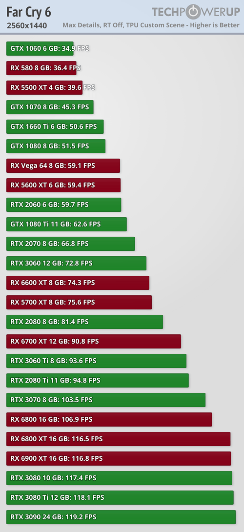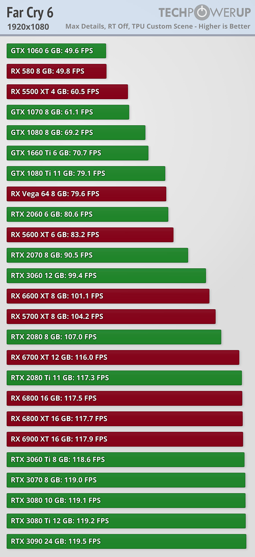 Долгожданная Far Cry 6 наконец то добралась до прилавков и уже успела попасть в руки множества тестировщиков игрового железа. Специалисты портала TechPowerUp решили проверить производительность игры на 25 актуальных видеокартах нескольких последних поколений Nvidia и AMD.
