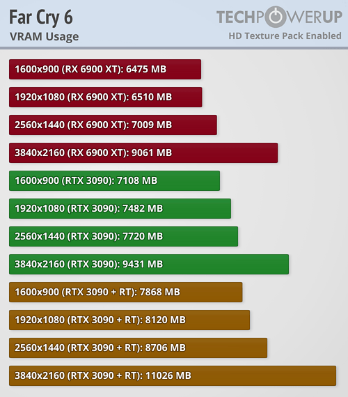 Отмечается, что сегодня в продаже можно встретить только 2 видеокарты, которые способны раскочегарить пакет текстур для Far Cry 6. Это: GeForce RTX 3080 Ti и GeForce RTX 3090. Теоретически, под требования подпадает и GeForce RTX 3060, но последнюю явно подводит скромный графический чип, что сводит на нет все преимущества от 12 Гб видеопамяти. Единственным выходом будет отключение поддержки HD Texture Pack, что позволит нормально играть на современных видеокартах.