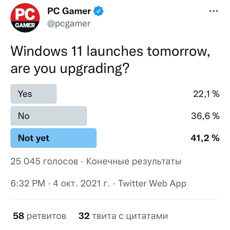 Портал PC Game в Twitter провёл опрос, дабы узнать какой процент пользователей уже обновился, а какой — нет. В опросе было три варианта ответа: «Да», «Нет» и «Еще нет». Спустя 25 000 голосов оказалось, что большинство до сих пор использует другие версии OC. В Твиттере 41% из опрошенных голосуют «еще нет», а колоссальные 36% голосуют категорически «нет».
