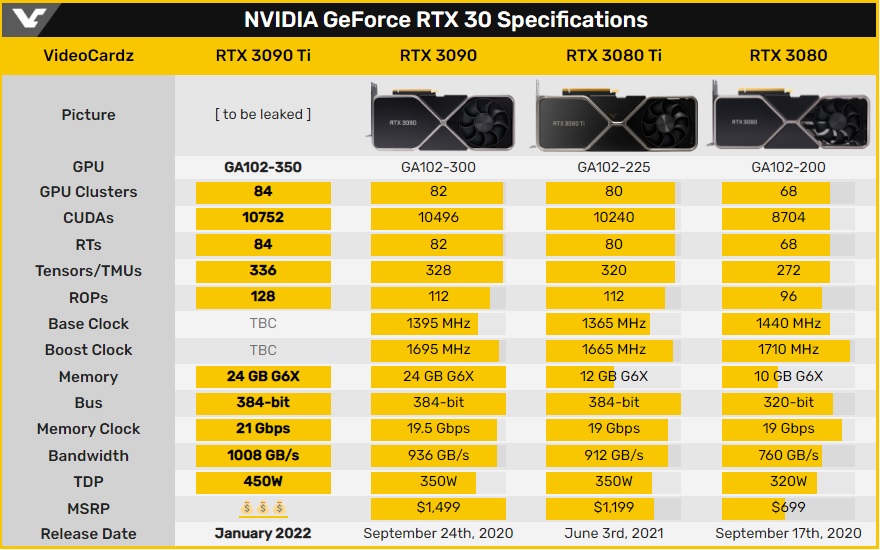 Интернет ресурс VideoCardz утверждает, что получил информацию о спецификациях видеокарты GeForce RTX 3090 Ti, ранее относящиеся к GeForce RTX 3090 SUPER. Текущие дорожные карты вообще не упоминают GeForce RTX 3090 SUPER, а его место занимает RTX 3090 Ti. VideoCardz заявляет, что NVIDIA поделилась спецификациями со своими партнерами по производству плат.