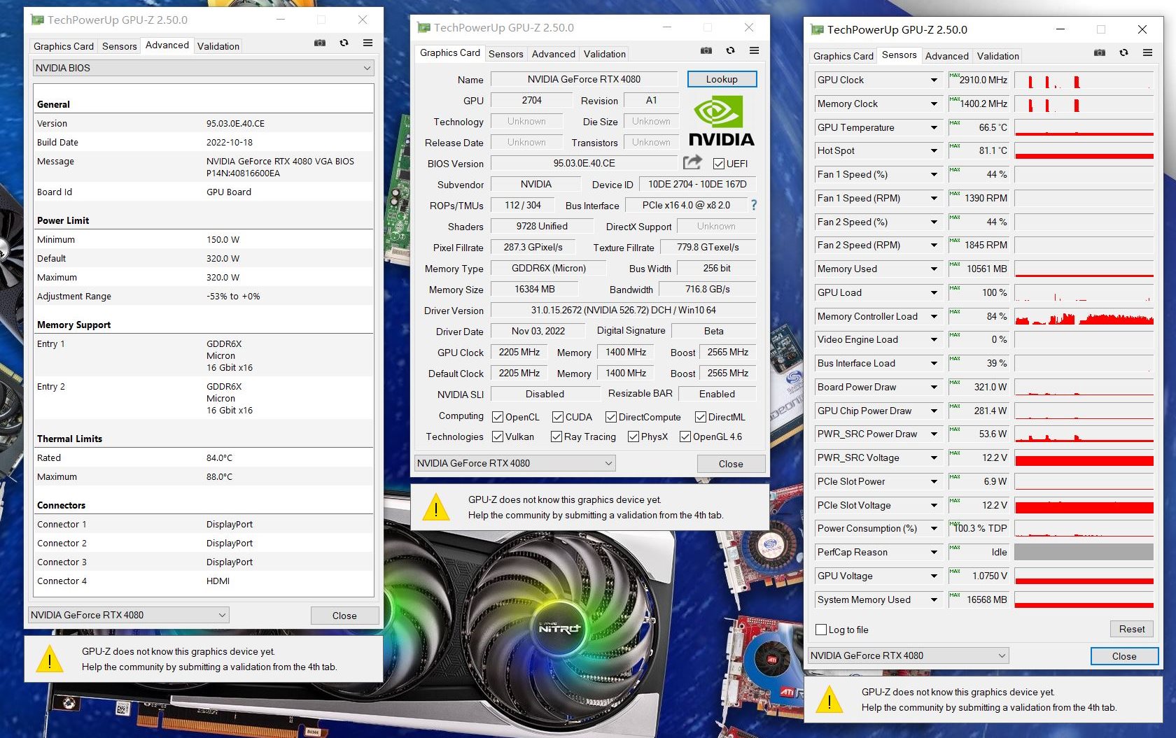 Видеокарта была протестирована на высокопроизводительной системе, оснащенной материнской платой ASUS ROG Crosshair X670 Extreme и процессором Ryzen 7 7950X. Карта правильно распознается как RTX 4080 с 76 вычислительными блоками, 9728 ядрами CUDA и 16 ГБ видеопамяти.