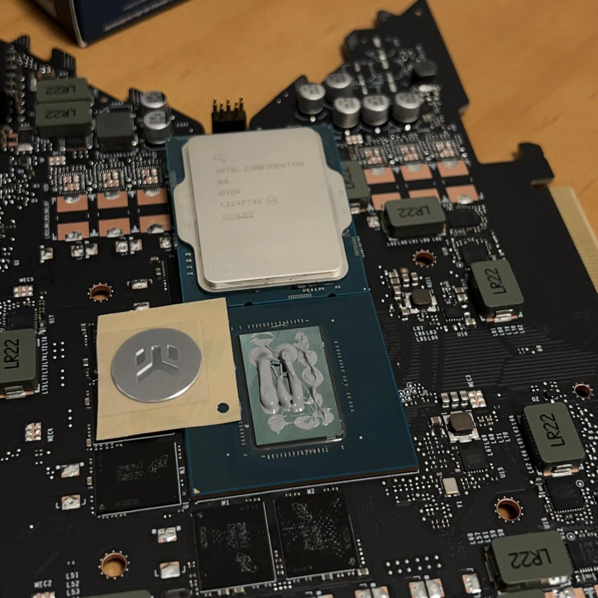 Чтобы скрыть некоторые детали от NVIDIA, инсайдер использует наклейку с логотипом EK и процессор Intel для покрытия некоторых частей платы и графического процессора. К сожалению, это также означает, что мы не можем видеть, сколько VRM фактически установлено на этой карте. Что не изменилось, так это 16-контактный разъем питания, который будет использоваться всеми будущими графическими процессорами RTX 40.