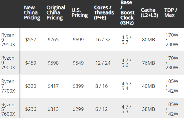 Процессоры AMD Ryzen 7000 появились на розничном рынке 27 сентября. Согласно Expreview, а цены на чипы Zen 4 уже впервые снизились менее чем через два месяца. Кроме того, процессоры Ryzen 7000 теперь дешевле в Китае, чем в США, что является редкостью.
