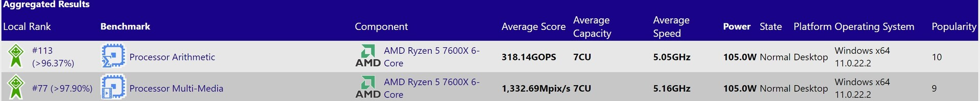 Для AMD Ryzen 5 7600 в этом тесте предлагается два результата: 259,72 GOPS для процессорных вычислений и 1084,75 Мпикс/с для мультимедиа. Для сравнения, у Ryzen 5 7600X совокупные средние показатели этих двух показателей составляют 318,14 GOPS и 1332,69 Мпикс/с соответственно.