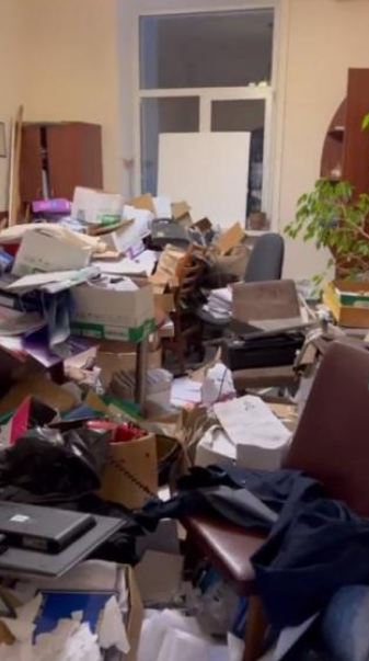 Областная администрация разграблена и по ней в поисках "для поживиться" безнаказанно циркулируют мародеры. Кабинеты чиновников представляют жалкое зрелище, и за какие-то часы превратились "в руины". В подвальных этажах "резиденции" находился музей, так вот, там все экспонаты поколоты-побиты. Не иначе братья мародеров - вандалы постарались.
