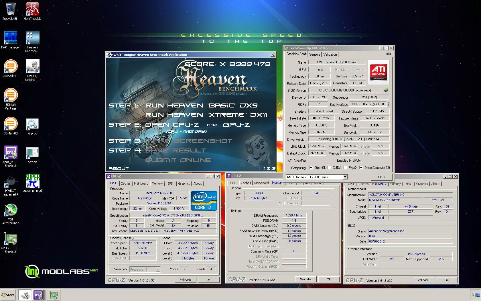 Сегодня в наше поле зрения попал оверклокер Mtech, получивший лучший результат в Unigine Heaven (Extreme Preset, DirectX 11) с использованием четырёх графических процессоров. В данном случае это квартет видеокарт MSI Radeon HD 7970 Lightning, компанию которым составила материнская плата ASUS Maximus V Extreme и процессор Intel Core i7-3770K.