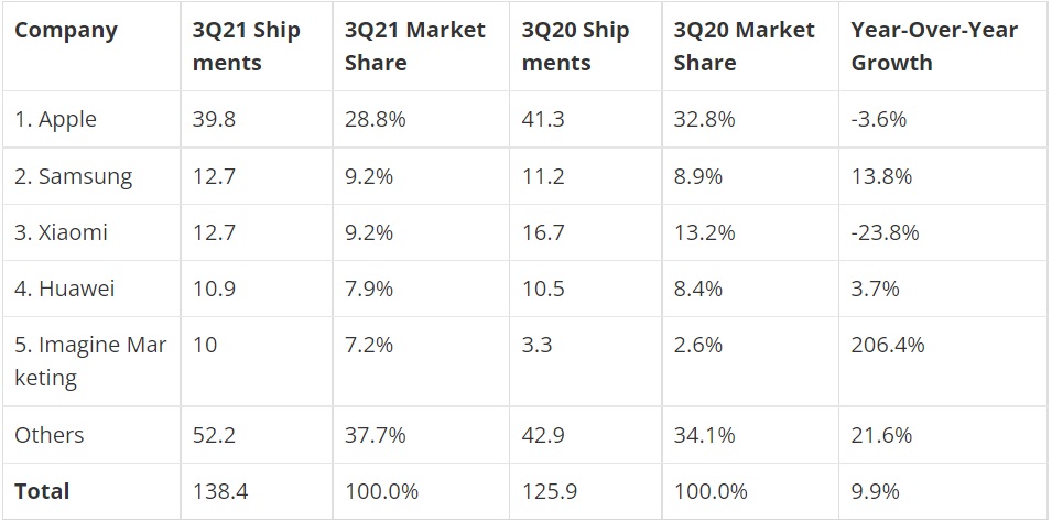 Apple в приведённой таблице находится на первом месте, несмотря на огромный спад поставок Apple Watch на 35,3%. AirPods и Beats сумели компенсировать это падение и помогли американскому производителю остаться лидером.