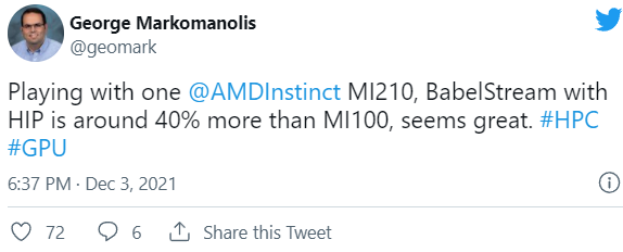 Согласно информации от инженера, работающего над суперкомпьютером LUMI, AMD негласно начала поставки своей карты Instinct MI210 для высокопроизводительных вычислений (HPC). Ускоритель можно использовать как внутри серверов, так и на рабочих станциях, и он будет конкурировать с Nvidia A100. Однако, AMD еще только предстоит официально сообщить о характеристиках карты.