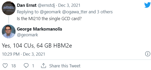 Итак, из сообщения ясно, что AMD уже начала поставки карт Instinct MI210 клиентам, в том числе в CSC - IT центр науки Финляндии, где строится суперкомпьютер LUMI 0,55 ExaFLOPS. Судя по всему, карта MI210 была анонсирована на каком-то мероприятии, поэтому официальные спецификации вскоре должны появиться.