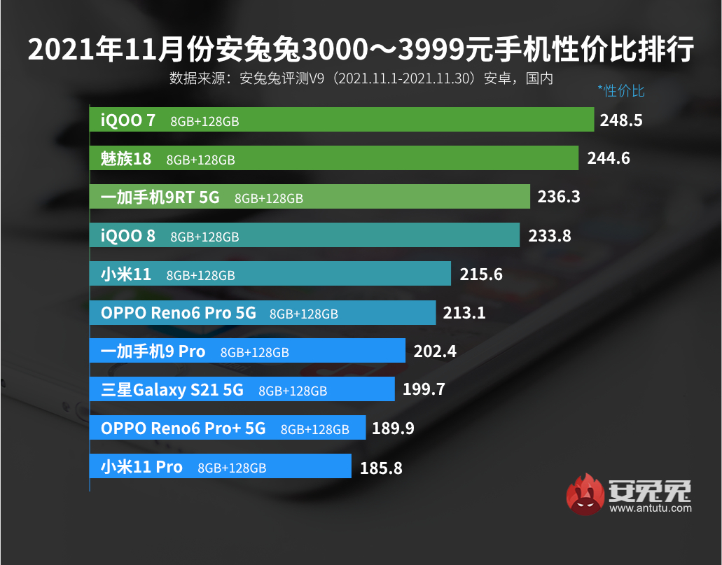 В первой категории лидирует модель vivo iQOO 7, но от неё не сильно отстаёт Meizu 18. Тройку лидеров замыкает OnePlus 9 RT, которому дышит в спину vivo iQOO 8. В пятёрку попал Xiaomi Mi 11, первый в мире смартфон на базе процессора Snapdragon 888.