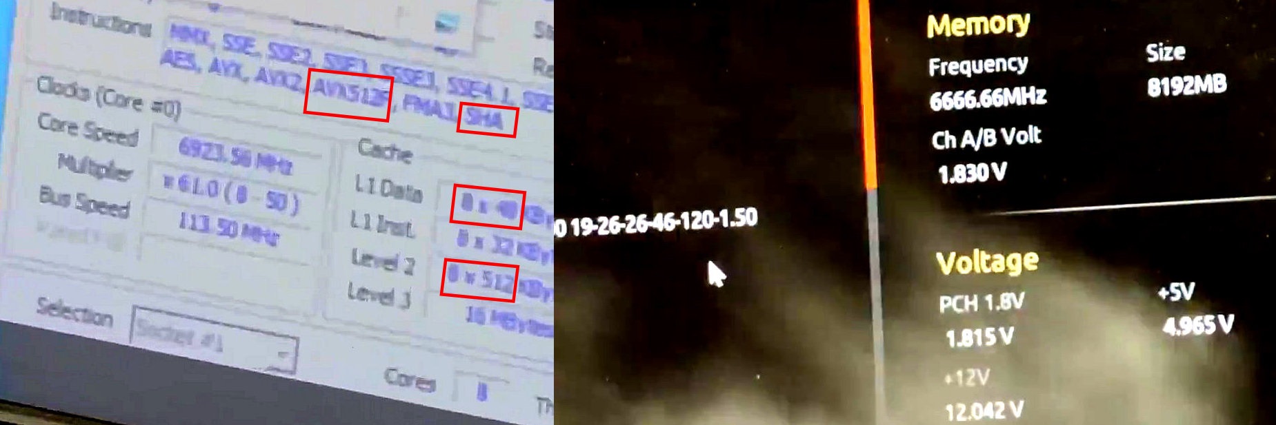 Пара коротких видеороликов демонстрирует непосредственно сам процесс разгона с использованием жидкого азота, однако «зоркий глаз» исследователей источника разглядел пару деталей, свидетельствующих о том, что в руках неизвестного оверклокера оказался именно образец десктопного процессора Intel 11-го поколения: судя по поддержке данным CPU набора инструкций AVX512F, а также конфигурации кэш-памяти, присущей ядрам с архитектурой Cypress Cove, можно сделать вывод, что используемая модель действительно принадлежит к семейству Rocket Lake-S.