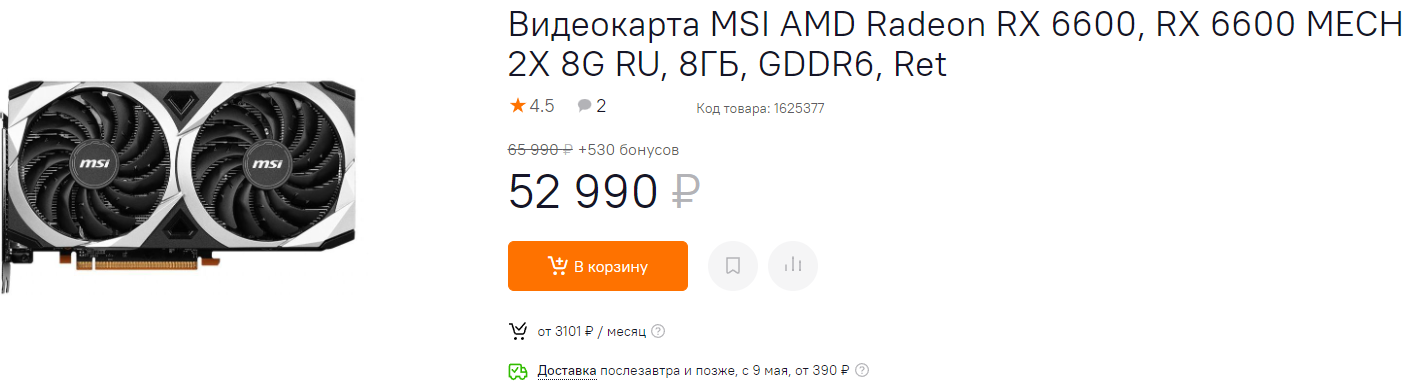 Сегодня мы имеем всего полторы страницы видеокарт. Многих моделей нет, а оставшиеся не демонстрируют разнообразия. Нам неизвестно, в чём дело. Вполне возможно, что геймеры активно разбирают видеокарты, что происходит быстрее, чем идут поставки. А возможно, поставок и вовсе нет, а магазины торгуют остатками. В любом случае вскоре мы об этом узнаем, а пока разберёмся, что ещё можно взять в Ситилинк на 8 мая 2022 года. Начнём с Radeon RX 6600. Это бодрый середняк, производительности которого вам хватит на несколько лет. Вообще покупать такую видеокарту стоит только владельцам монитора с разрешением 1080р, ведь в 2К могут возникнуть проблемы с низким количеством кадров в секунду и постоянными просадками в сложных сценах. От игры к игре Radeon RX 6600 демонстрирует различные возможности, поэтому однозначно заявлять о том, что видеокарта гарантирует вам 60fps@1080р, мы не будем. Текущая цена самая низкая с момента выхода на рынок. Если честно, мы ещё никогда не видели эту видеокарту за 53 тысячи рублей.