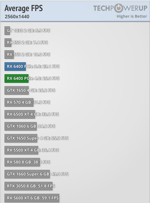 Ввиду всего увиденного настоятельно не рекомендуем смотреть в сторону Radeon RX 6400 и Radeon RX 6500 ХТ владельцам систем с поддержкой PCIe 3.0. При прочих равных купите видеокарту производства NVIDIA, либо доплатите за более мощную Radeon RX 6600. Последняя одинаково хорошо работает как с новым интерфейсом PCIe 4.0, так и со старым PCIe 3.0. На изображении выше вы можете увидеть результаты теста Radeon RX 6400 в разрешении 2К. Увы, но даже с поддержкой PCIe 4.0 видеокарта оказывается медленнее GeForce GTX 1650. Учитывайте всё это при выборе новых бюджетных графических чипов AMD.