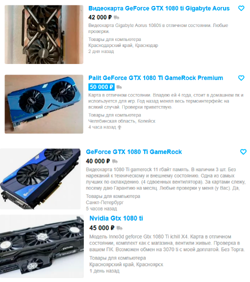 Вообще на многих рынках видеокарты уже почти достигли рекомендованной стоимости. Это значит, что жители США могут купить GeForce RTX 3050 за 250 долларов, тогда как наши читатели вынуждены тратить на неё около 700 долларов. Можно сколько угодно рассказывать нам о последствиях санкций, но нам кажется, что во многом такое положение вызвано нежеланием магазинов скидывать цены. Есть опасения, что геймеры тут же раскупят все оставшиеся на полках видеокарты, а новых завозов не так уж и много. Найти виновных сложно, поэтому мы попытаемся потратить условные 45 000 рублей максимально эффективно. Нам кажется, что самой быстрой видеокартой на вторичном рынке за 45 000 рублей является GeForce GTX 1080 Ti. Это уже побывавший во многих сражениях флагман, который переживает вторую волну майнинга. Именно поэтому, если вам очень сильно не повезёт, то вы можете напороться на видеокарту, которая уже несколько лет без устали копает Эфир. Но об этом ниже.