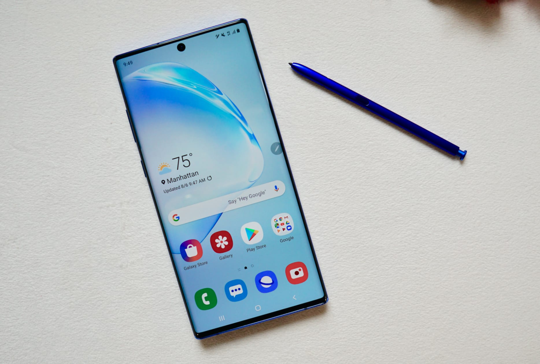 Samsung Galaxy Note 10 поддерживает ввод с помощью пера S-Pen оборудованного адаптером беспроводной связи Bluetooth, гироскопом и акселерометром. Корпус изготовлен из стекла и металла. Спереди и сзади установлены панели Gorilla Glass последнего поколения производство компании Corning.