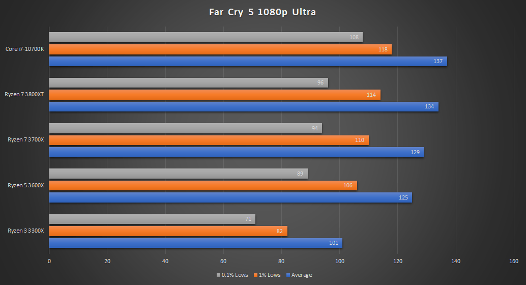 В тесте все три чипа: Ryzen 5 3600XT, Ryzen 7 3800XT и Ryzen 9 3900XT. Отметим сразу, что эксперты сайта Нardwaretimes в первую очередь выбирали наиболее оптимальный игровой чип, поэтому младшая версия не может считаться ориентиром для лучшей покупки. Точно также старшая модель, поскольку она пока стоит слишком дорого и в первую очередь интересна в качестве создания рабочей станции. Это значит, что будут сравниваться два прямых конкурента: 8-ядерный Core i7-10700K и 8-ядерный Ryzen 7 3800XT. Никакой синтетики, только игровые тесты.