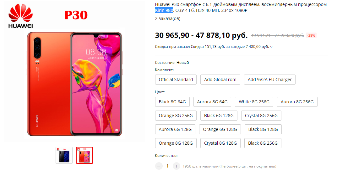 Ещё недавно производительный флагман 2019 года – HUAWEI P30 стоил больше 60 000 рублей. В последнее время цена на него постоянно снижалась. Младшие версии и новые телефоны напирают. Сегодня на площадке Аliexpress его можно взять со скидкой 20 тысяч и выше. Кажется, что уже лучше предложения не будет. В этом случае радует российская розница. Здесь неожиданно цена упала ещё ниже. Так, многие ритейлеры опустили его стоимость ниже 30 тысяч рублей. Это значит, что выгода составит больше 30 000 рублей.