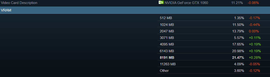 Есть надежда, что вскоре NVIDIA порадует нас моделями на 24 Гб, но, кроме слухов, подтверждений данной информации нет. Это значит, что пока стоит ориентироваться только на те решения, что есть в свободном доступе. Великий и могучий Steam ведёт постоянный мониторинг оборудования геймеров. Это не самый надёжный источник информации, но лучше человечество пока не придумало. Давайте посмотрим на изображении ниже, там можно рассмотреть показатель количества памяти на видеокартах.