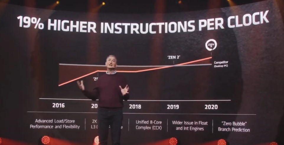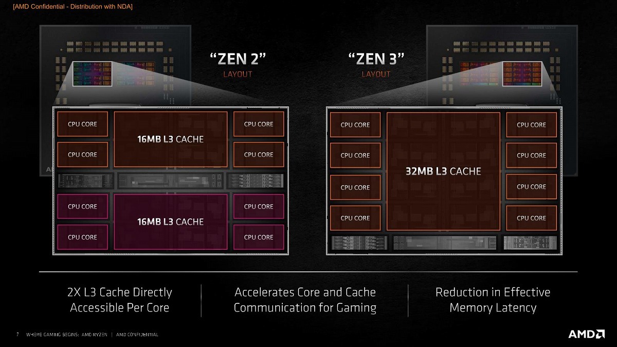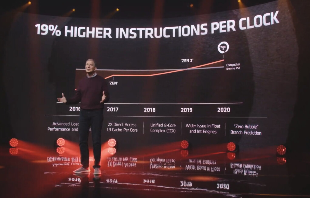 Новые процессоры по-прежнему имеют чиплетную структуру и производятся по 7-нм нормам, однако теперь «полный» CCX-комплекс наделён 8 ядрами, каждое из которых имеет прямой доступ к 32 Мбайт кэш-памяти третьего уровня. Таким образом, в зависимости от модели, один чиплет будет иметь 6 или 8 активных ядер. Кроме того, инженерам AMD удалось добиться небывалого прироста количества исполняемых инструкций за такт — согласно «замерам» специалистов компании, увеличение IPC составило впечатляющие +19 % по сравнению с прошлым поколением.