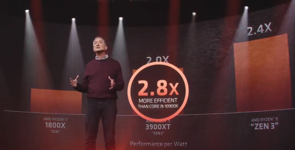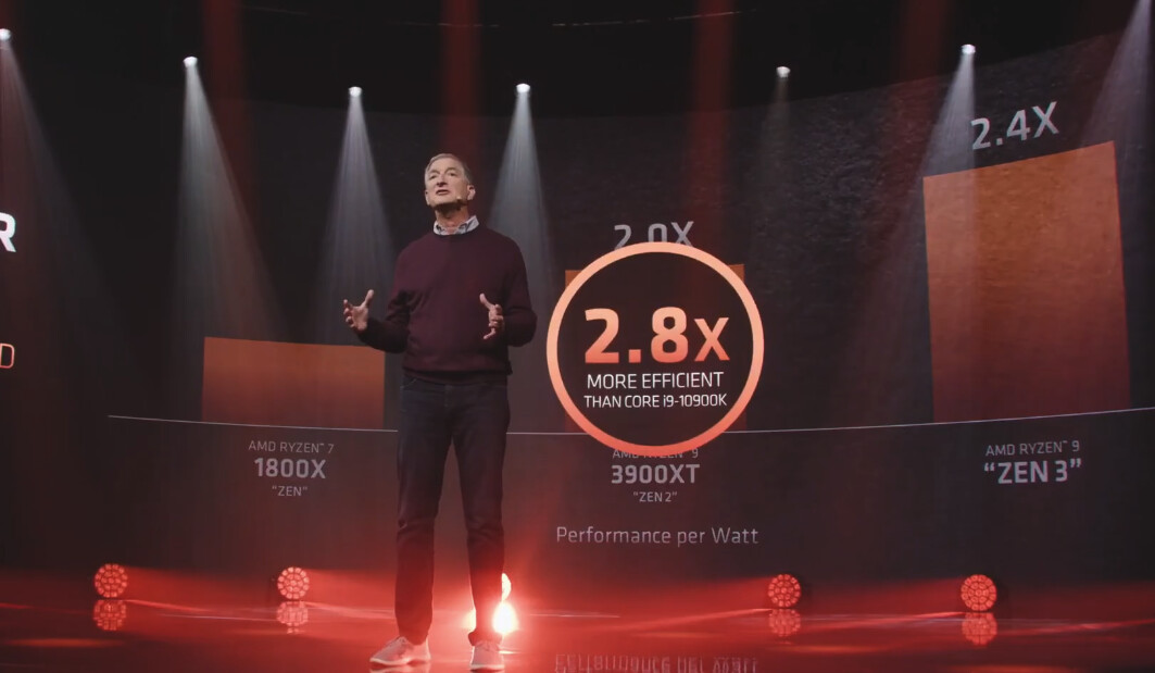 По сравнению с флагманом Intel Core i9-10900K процессоры AMD Ryzen 9 на основе архитектуры Zen 3 обеспечивают энергоэффективность лучше в 2,8 раза.